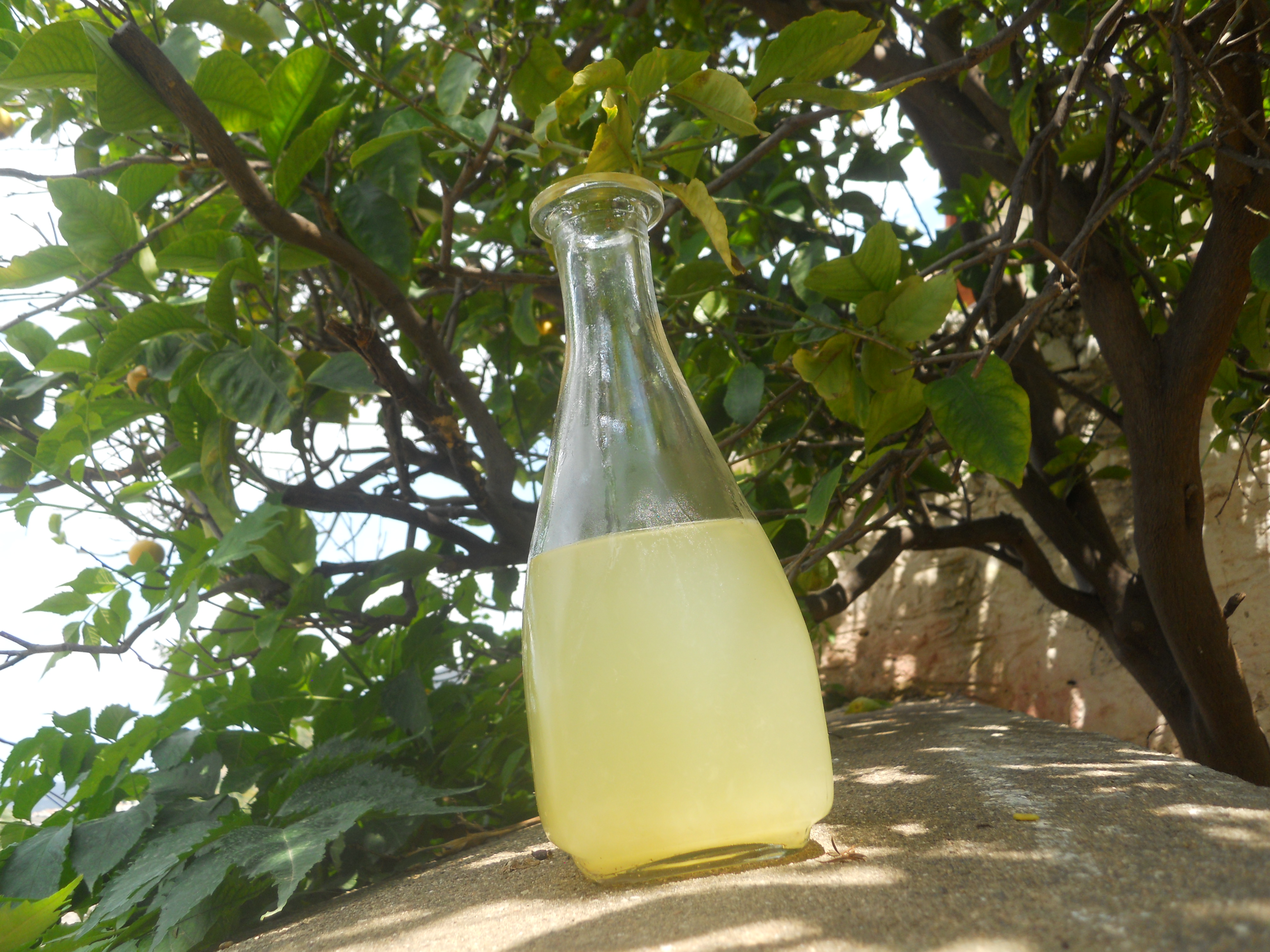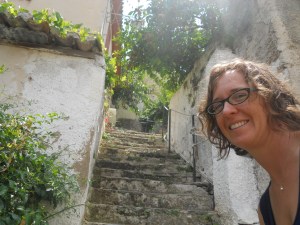 up beyond our place. If you turned left right there at the bottom, you’d be on our terrace. The second picture is of the gate onto the terrace. To the left of where I’m standing in that picture is a bush that currently has three cats who are either fighting or well, the other thing, and they are making such a ruckus of it, morning, noon and night. We are somewhat dismayed at the difficulty we are having judging whether they are enemies or lovers. Maybe both. In any case, we are really trying not to be voyeurs. The next picture is of the freshly-squeezed lemonade I’ve been making each morning from lemons picked from the lemon tree behind it. The picture above is of the view from the lemon tree side of the porch, looking at the white gate at the entrance. Here we sit working away under our canopy. Looking out at this view. So like I said, the life of leisure. I assure you, we’re working hard.