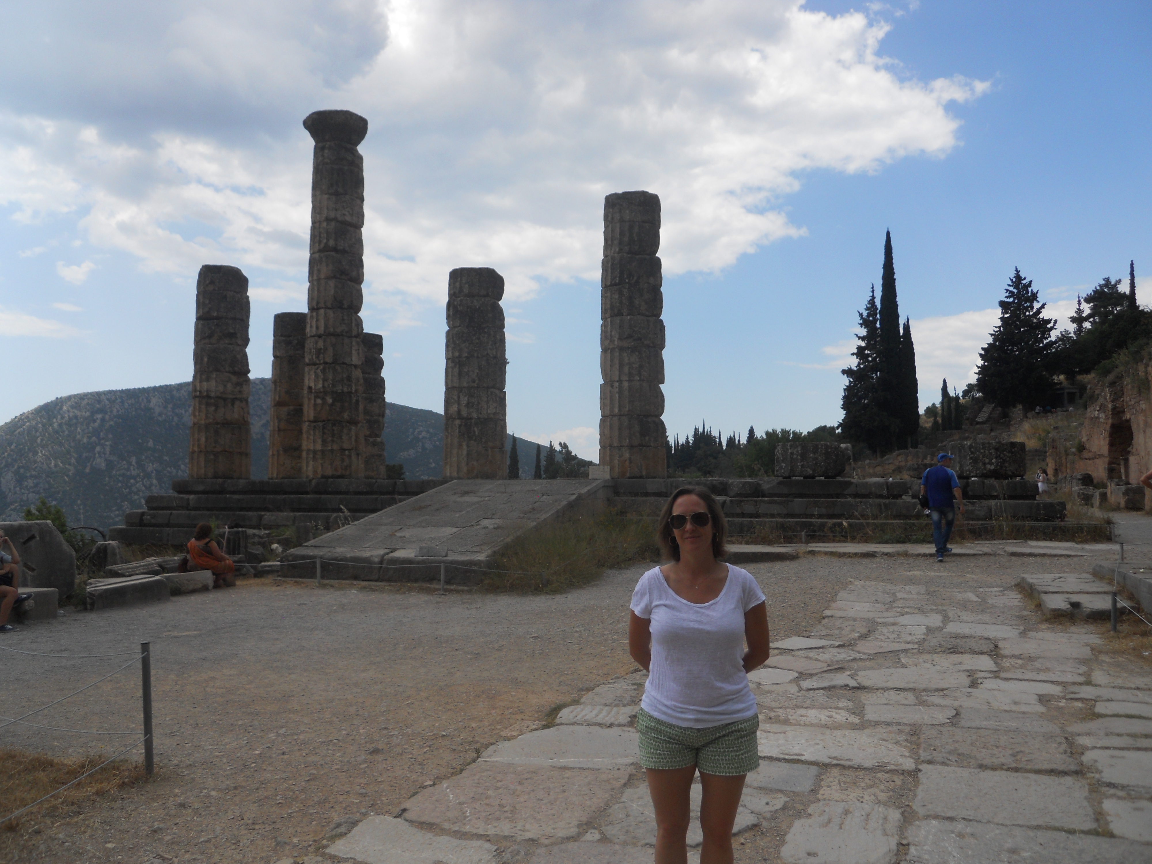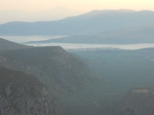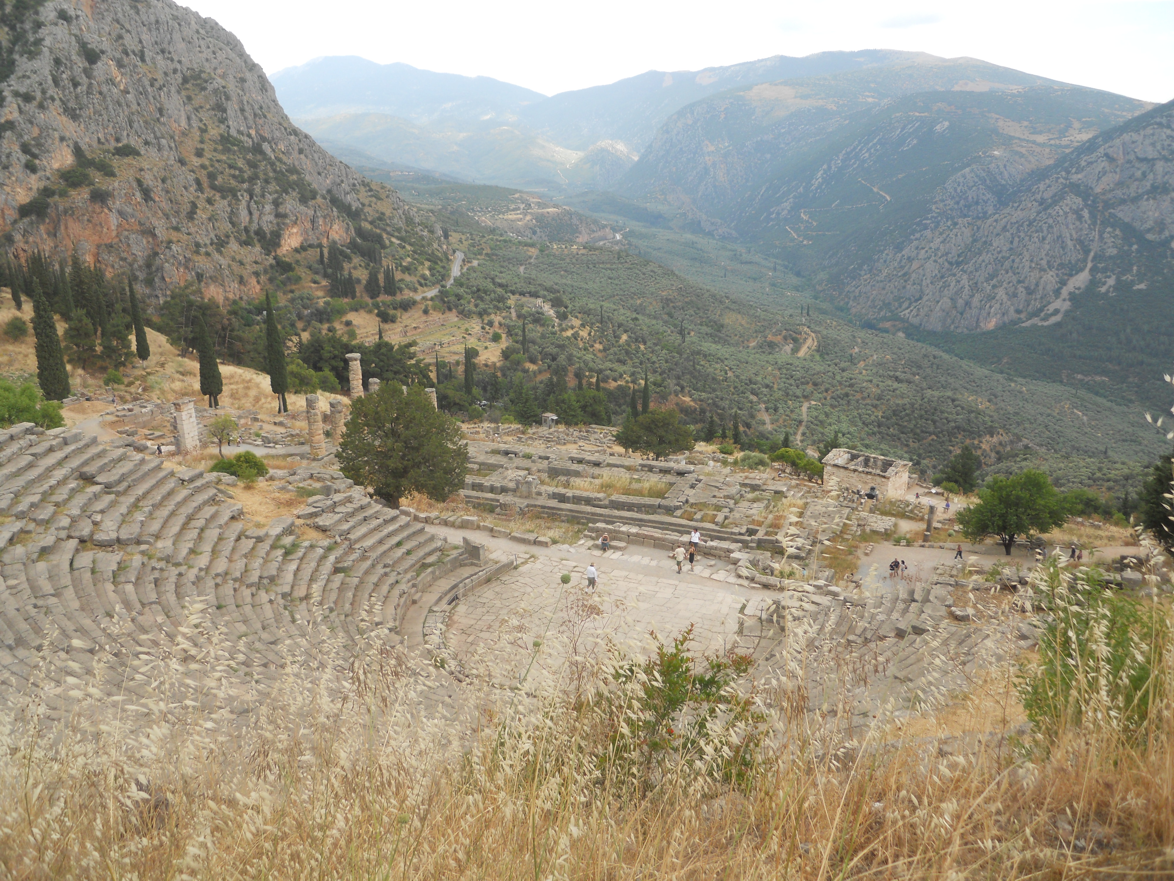 We arrived in Delphi and looked over the valley that cuts through the mountains up to the water and thought, the gods must be near.  This first picture is the view from the place we had dinner last night, which is also pretty much the view from our hotel room.  Today we trekked up to the Temple of Apollo where the Oracle of Delphi, who was called a Pythian in light of the story that Apollo replaced the Earth Goddess, Ge or as Hesiod DSCN2144later calls her, Gaia, when in the form of the dolphin, he defeats the snake (Pythos) who was the son of Ge / Gaia.  While the landscape holds me in awe still, the temple ruins didn’t give me the same sense of the nearness of the gods.  Though indeed, many have prayed here.