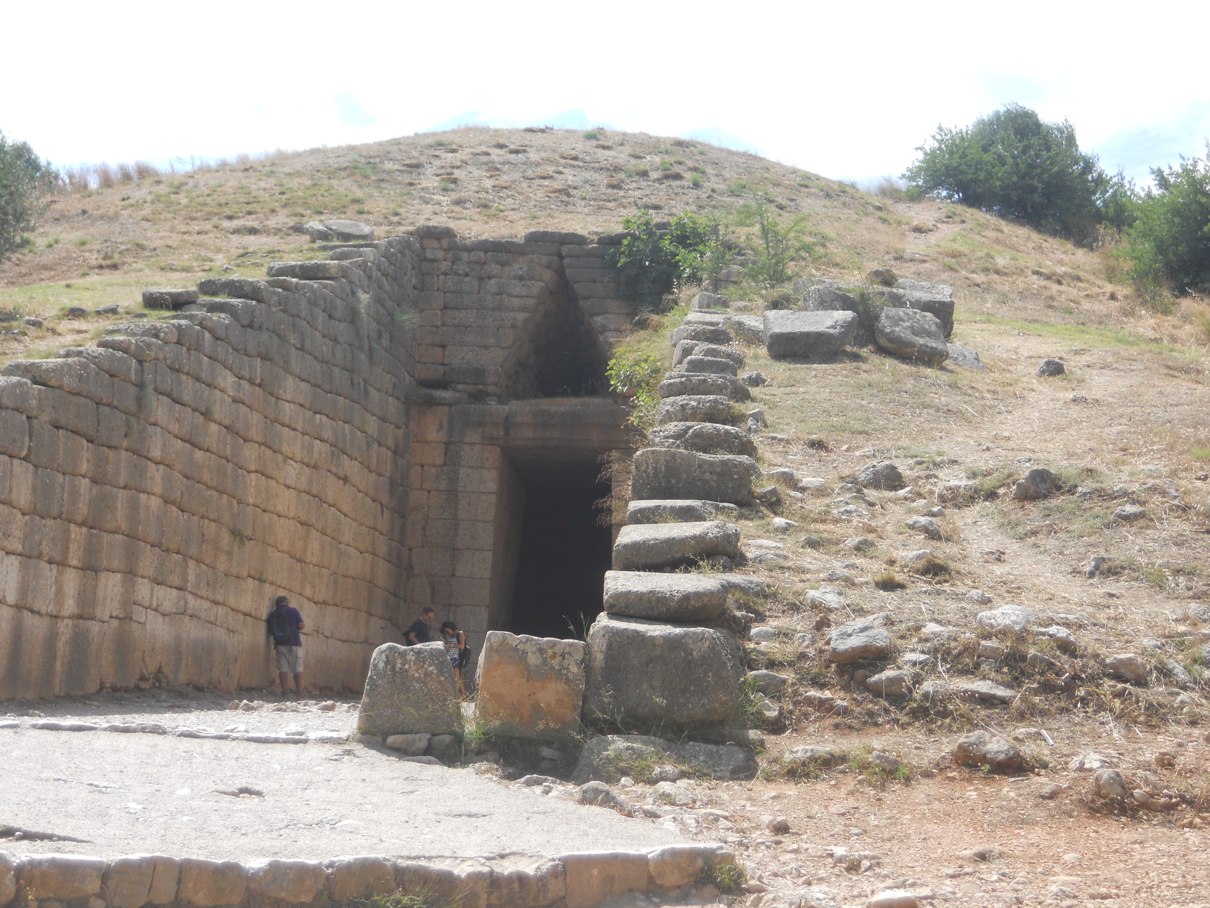 This site at Mycenae dates back to around (historians say ‘circa’ and abbreviate it with a c) 1500 BCE. Homer’s epics come out of the Mycenaean world, but it seems that the Trojan war would have been considerably later than the height of Mycenaean civilization so there might be some conflation of stories together. In the Iliad, Homer writes about the king of Mycenae, Agamemnon, who had a, shall we say, dysfunctional family, like many of the families who star in Greek epics and tragedies. Agamemnon’s grandfather was Pelops, the first hero of the Peloponnese. When Pelops was young, his father Tantalus not so kindly served him in a stew to the other gods. But Demeter rescues Pelops, “I’d recognize the taste of this shoulder anywhere,” she says. Pelops’ family learned something from this incident, which was basically, hey, you got beef? Serve up your enemy as beef. So Pelops’ kids, Atreus and Thyestes, get into it and Atreus, the father of Agamemnon, serves up Thyestes’ kids to Thyestes. Aegisthus is
