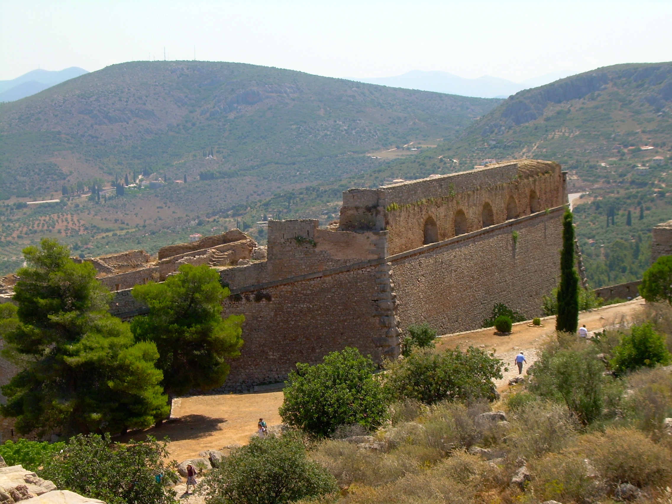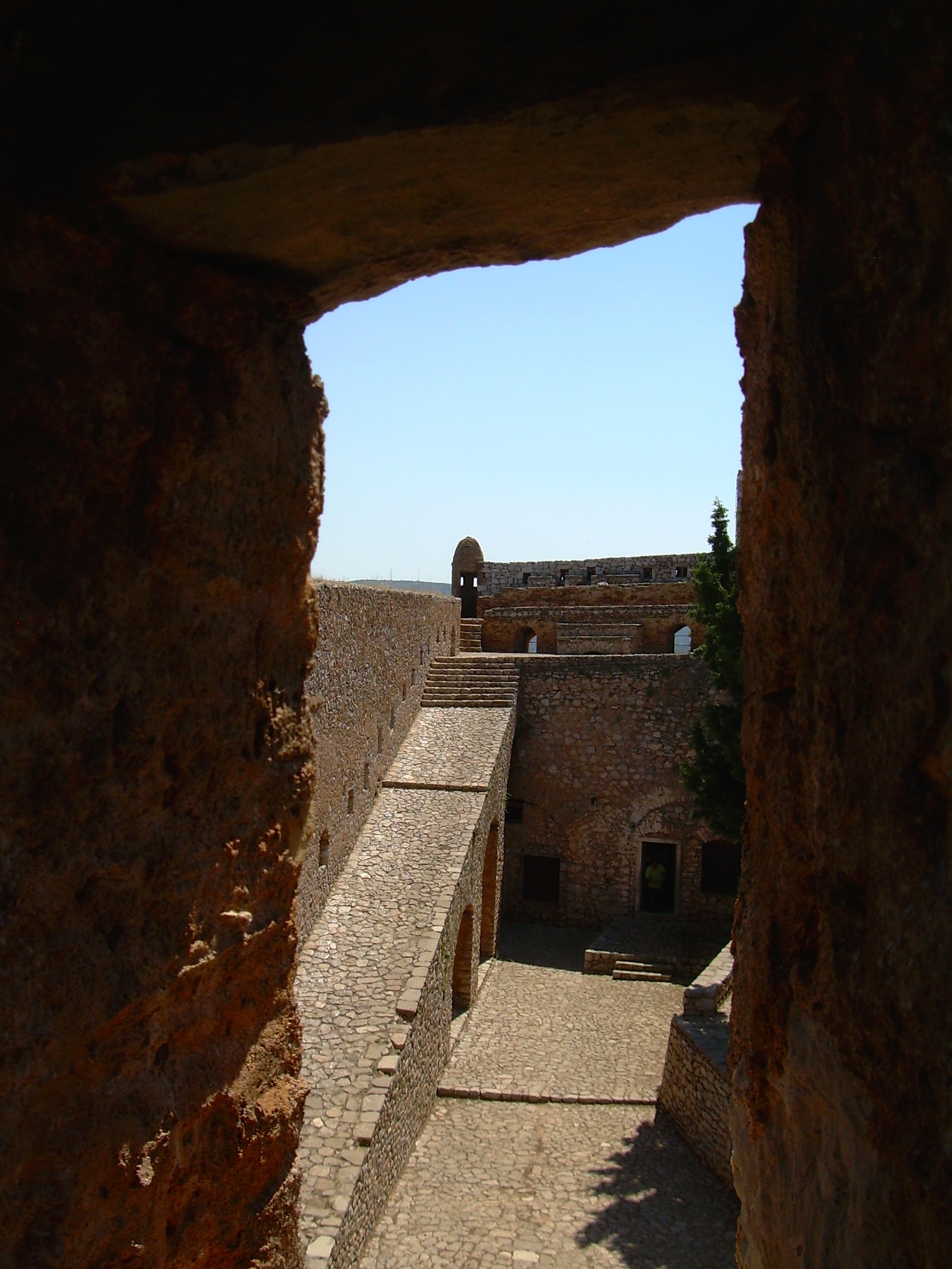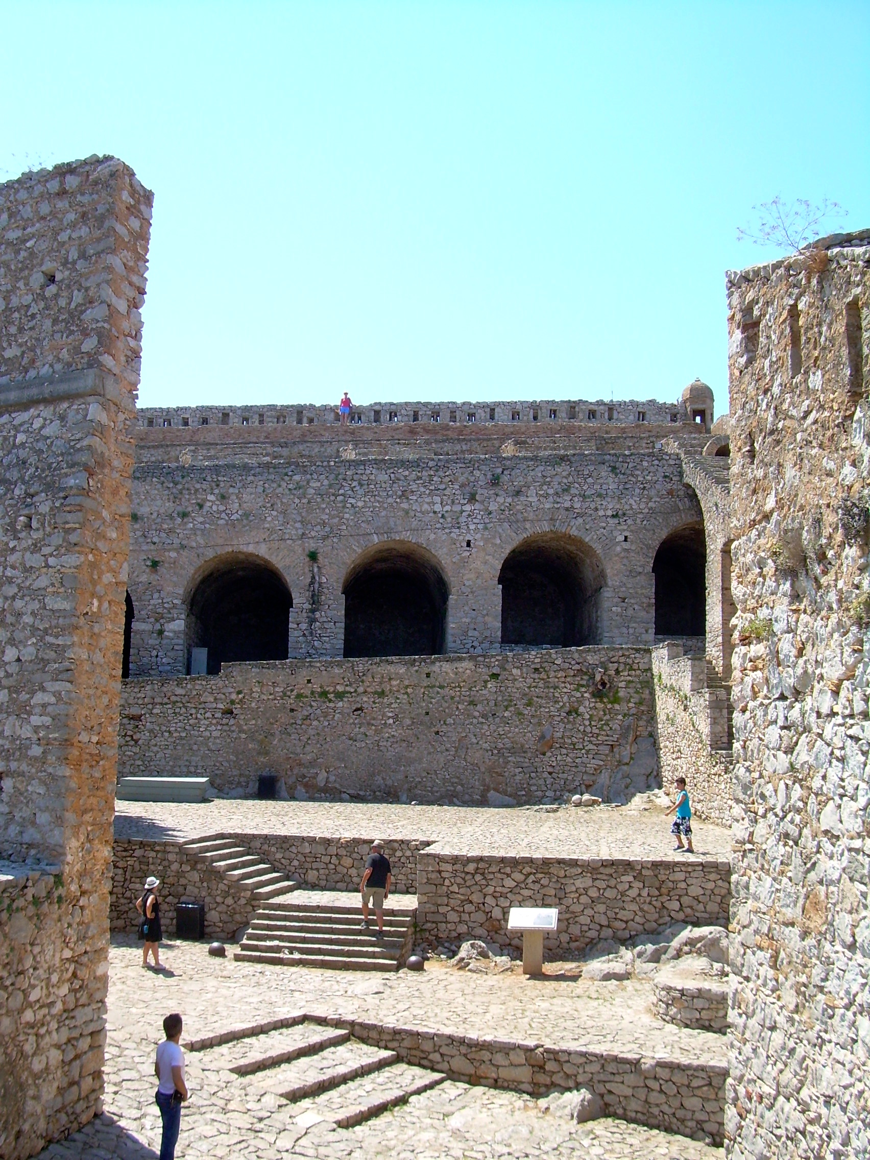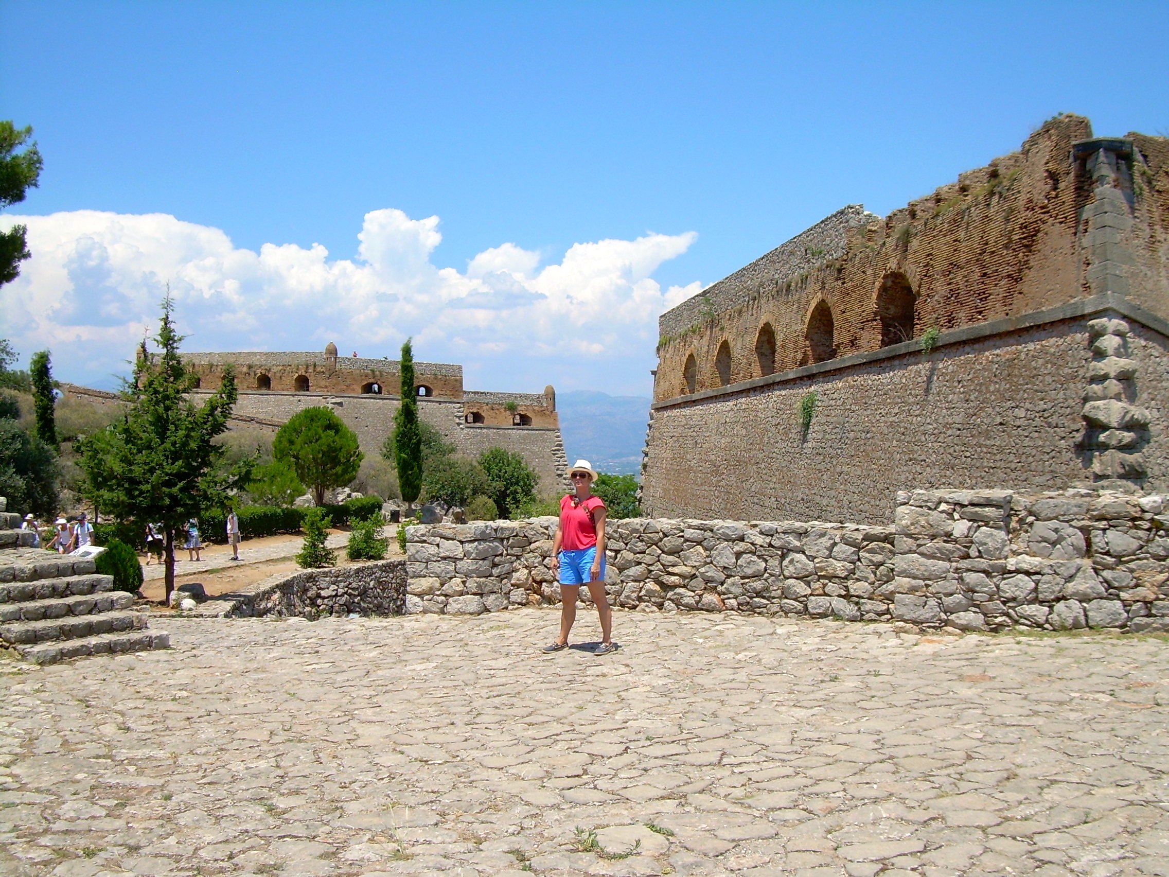 then opens into another wide space, like the center of a fortress with a wall that is remarkably well-preserved. But from the top of the wall you can see a much farther upper bastion to the right / straight ahead and then another cluster of buildings including a building where Kolokotronis, the general who defeated the Ottoman Empire in the Greek War for Independence in 1822, was imprisoned. The first picture below has me up on the high wall — it’s at the center of the fortress. From that high wall you can see the last two pictures on that row and the last picture on the row after that.
