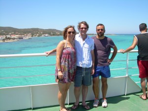 which they have found ruins. You can actually scuba dive down and see the ruins on the floor of the sea. At Simos, we went to the beach, on the far side (south) of the island, which was amazing. I need to find another word, but that’s really what I kept saying. The sky was blue. The water was blue. The beach was sandy and soft and clean. And there weren’t that many people there. We went pretty far out into the water, as it seems people really like to do in Greece. Jeff and I had the humbling experience of playing paddle ball in front of a lot of other people playing paddle ball who could actually play paddle ball. Kosmas and Jeff and I hit the volleyball around a bit — nice to get some exercise and not just laze on the beach. All the local talk was about how the beach might be privatized. Apparently, Brad Pitt was in town asking about buying up property. The locals are not happy.