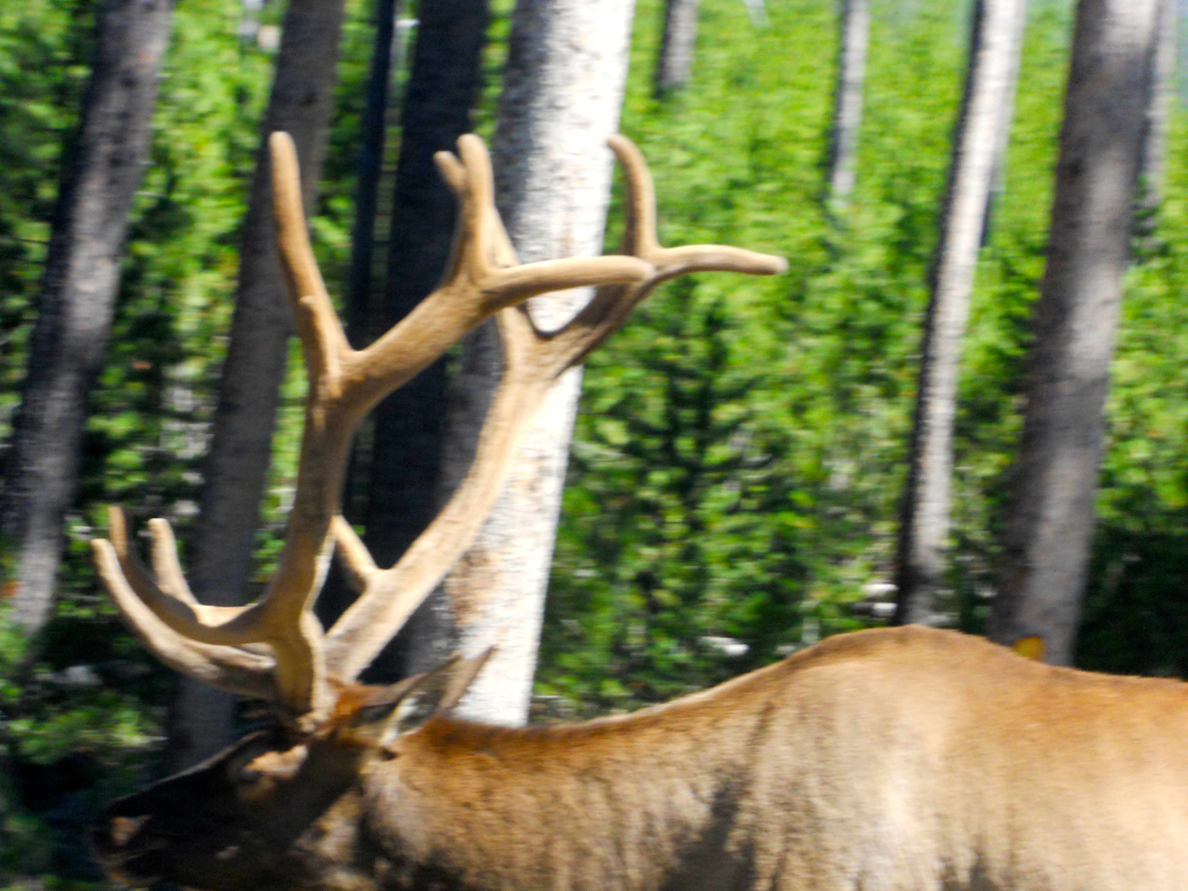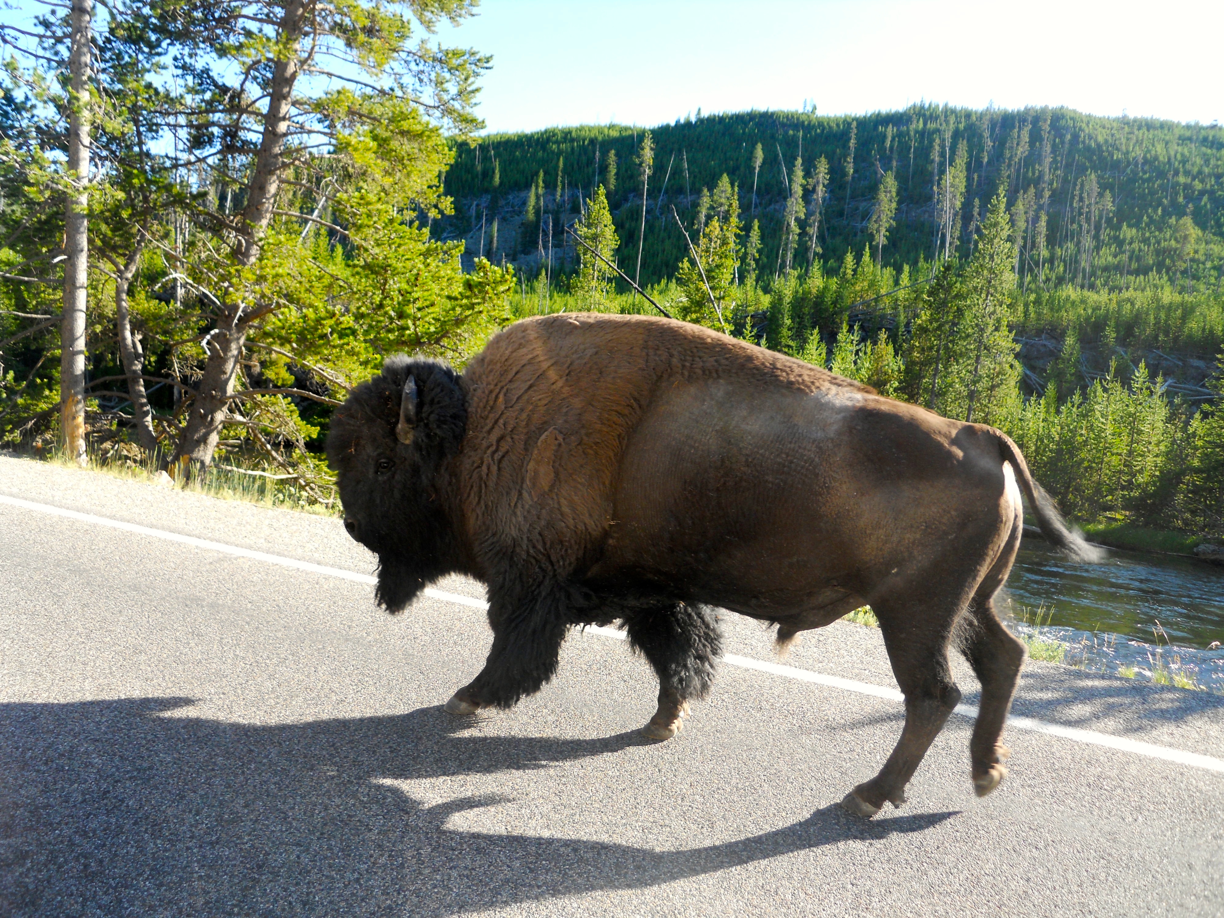 That same day we went all the way south to Old Faithful. The literature put out by the park which we read later told us that the geyser erupts on average every 88 minutes, so we were lucky that it erupted about forty-five minutes after we got there (just enough time to get ice cream!). Most people know that Yellowstone has more geysers than any other place on earth, but I didn’t realize that it is not the biggest or tallest geyser. It is regular, but the interval between eruptions appears to be expanding over time. Driving back up from Old Faithful, we saw a bison come barreling down the road– something must have spooked it because it was moving pretty fast. It walked right by our car and I got a great picture of these really quite majestic creatures.