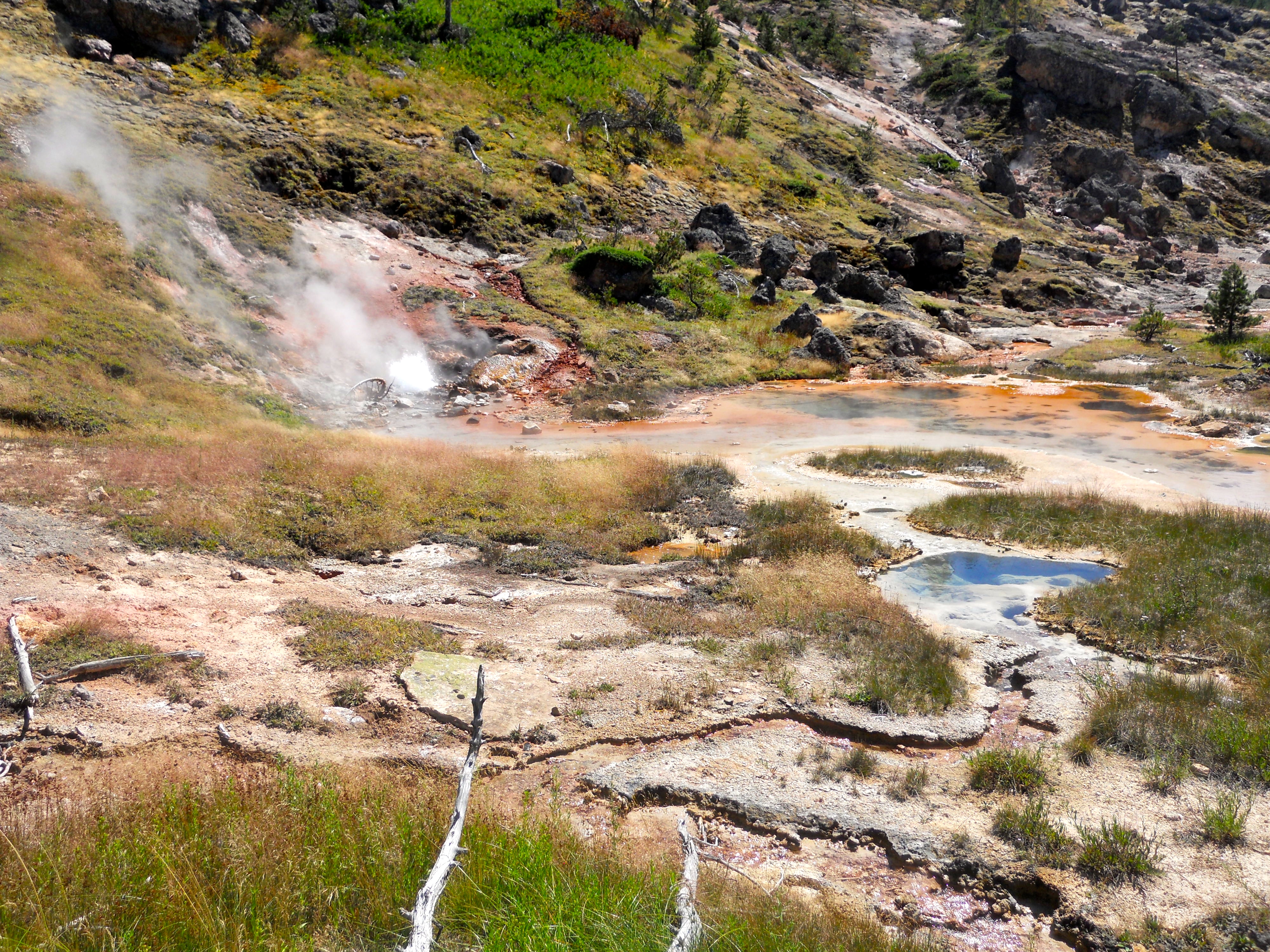 My dad grew up northwest of Great Falls, Montana, in Fort Benton, a small town called “the birthplace of Montana” and one of the prettiest towns in America by Forbes Magazine, but I’d never been to Yellowstone. So the first day we were there, we drove into the park and toured the Mammoth Basin which is full of hotsprings, and then walked through the paintpots between Mammoth Basin and Norris. I thought we were going to see actual artist paintpots, but the thermal features there (that’s what they call geysers, hotsprings, mudpots and fumeroles – see more at the National Park Services’ website) all produce various colors because of the reactions between the thermophiles and the water. Driving through, we noticed a private residence in Mammoth Basin because apparently there are houses that people still own because their families were grandfathered in because they owned the land before the park was established in 1872, which I think was only a year after Montana itself became a state (the park is in Montana and Wyoming, mostly Wyoming). I’m not sure I’d want to live in Yellowstone unless it was a little more removed from the tourist scene than this house was.