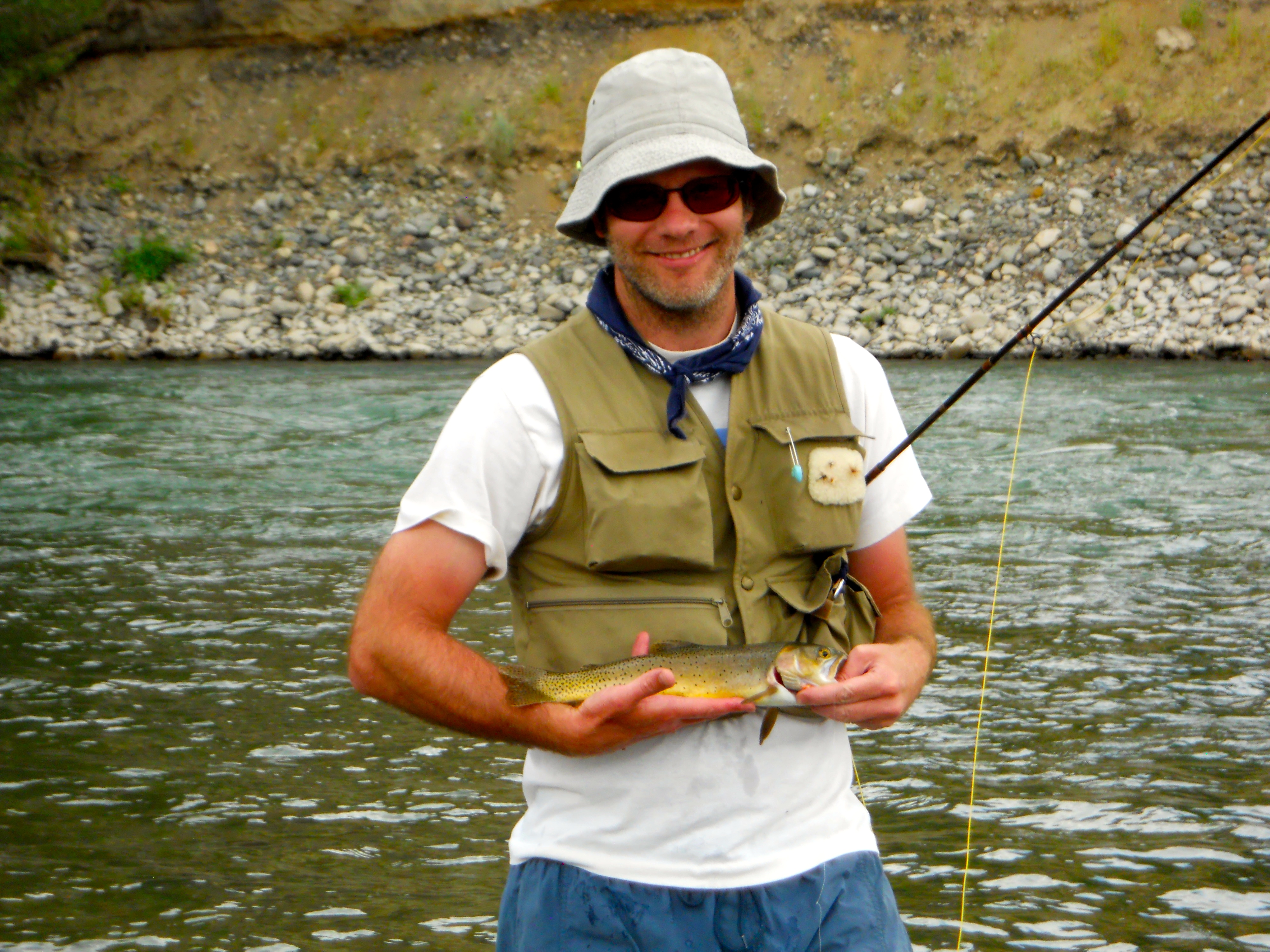 By the end of the week, Jeff was not having such great luck fishing, which was disappointing. Friday afternoon he took me down to the Yellowstone behind the cabin to show me how to fly fish. I’ve baitcast before when I was younger and caught plenty of fish, but I’ve never flycast. And I think I’d get bored pretty quick. I am not someone who is good at staying in one spot for very long. So I tried for a bit. Jeff said nice things about my form. But I thought, do I want to do this for a half an hour if I’m not going to catch something? I didn’t have a very optimistic outlook. So Jeff took the rod back and immediately got a 14-inch brown trout. Actually, I was thrilled to watch him catch a fish – playing him on the line and then slowly wearing it out. Jeff’s mom had just come down to the water right then, too, so we both got to watch him reel it in. I got some nice pictures and then he let it go, catch-and-release further confounding my appreciation of flyfishing.