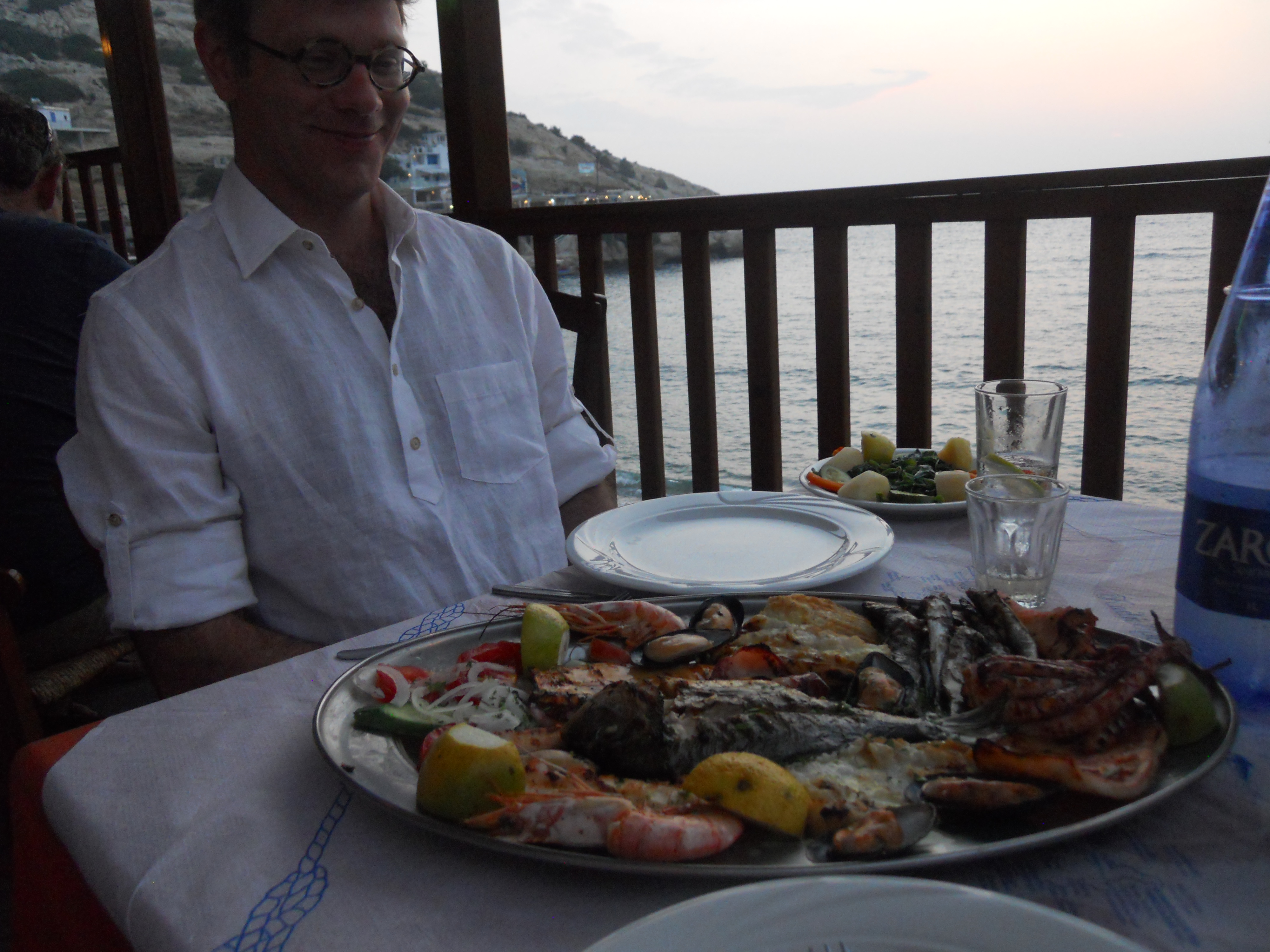 In Matala, we had an amazing meal of fish (fish platter for two for €28) at Sirtaki, as we watched the sun fade into the haze. When we asked if the platter for two would be too much food, the waiter said, well, no, it’s fish. I guess you can never be full on fresh fish. For dessert, they brought us fresh loukoumades, watermelon and raki and the waiter shared a shot of raki with us when he came by to check on us. Yiamas!
