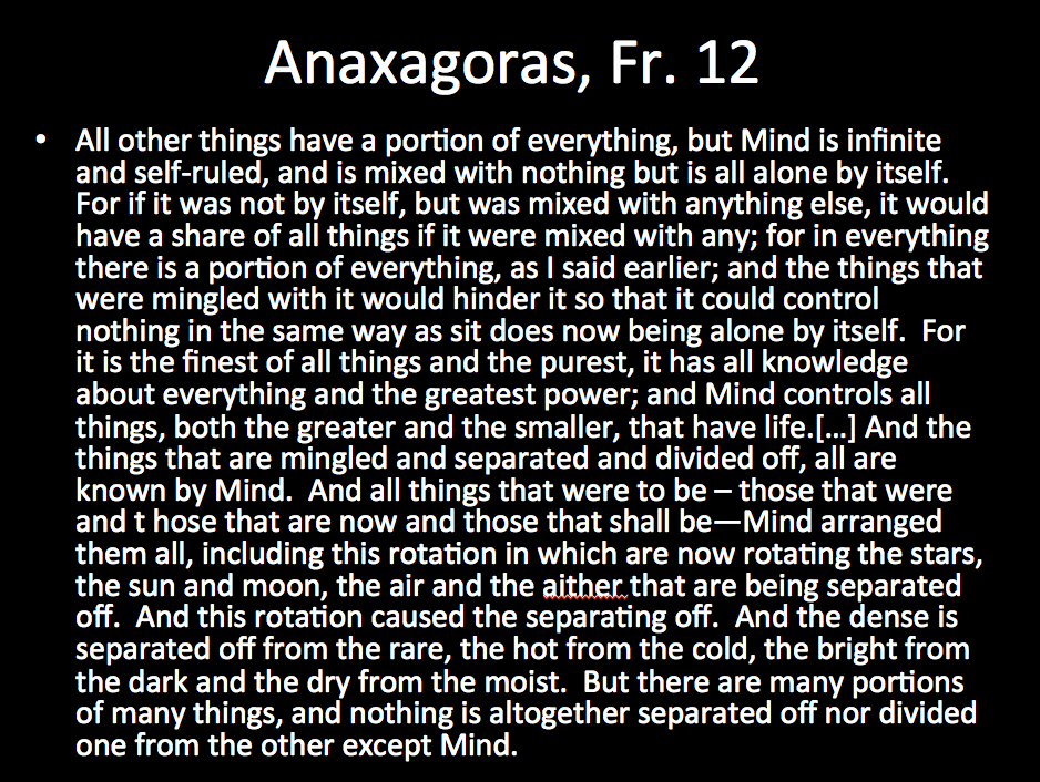 I asked them to discuss the meaning of the passage and to consider how Anaxagoras is drawing on Hesiod. Students could see that the elements remained, that there was an order to them, but that now, something called “Mind” was organizing things. Then I posted another slide.
