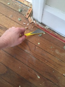 Today was my first full day of working on the new house. At day’s end, my finger pads are sore, my arm is bloody, and I’m exhausted. Turns out, this is what all that weight lifting this semester has been in preparation for. The day we closed, we went over to the house and pulled the carpets up and discovered beautiful wooden floors beneath them. The project of today was to pull up the tack boards that the carpet had been nailed into. That didn’t sound like that much work to me. But it took me five and a half hours to do two rooms (I had planned on doing three, but cut out from exhaustion after two — this would seem to be one of the rules of DIY home improvement projects: the project will always take at least one and a half times as long as you estimate it will take). Part of the problem is that I had to figure out how to do it first. I was using the back end of a hammer which was practically impossible because the boards are too close to the wall so I couldn’t get any leverage, so I googled how to do it and someone said, get a pry bar, so off to Lowe’s. I found a tool that pried on one end and pulled nails on the other. (Another rule of DIY home improvement projects: the right tool is key).