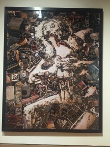Muniz is a Brazilian artist who uses unusual material for recreating famous works of art. Muniz himself notes that his material is more ordinary than the materials that create paint have traditionally been–he uses peanut butter and jelly to recreate Mona Lisa, for example, GI Joe plastic toys to recreate famous photographs, recovered trash to recreate paintings, torn up postcards to recreate photographs of the youngest person to be executed by the electric chair. His work makes the ordinary extraordinary, and shows the way that high art has become part of the backdrop of our everyday lives. He says he relies on a “poster store iconography.” Working with big canvases, Muniz produces work that up close make the materials very apparent and far away show, as he himself explains in documentary film in the exhibit, the mind of someone else. Somewhere in between is a moment of a threshold where the ordinary materials manifest the mind of an artist. One of the themes of Muniz’s work is how the camera can change the way that we see. I found a number of times that big pieces did not come into focus to me until I took a picture of them, as with Old Cheyenne and Guernica. Now is the time for changing the way that we see.