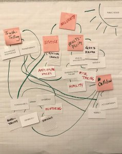 One part of the process that I found fruitful was the conclusion: the organizers brought in sympathetic colleagues who had not participated in the workshop to hear groups report on the specific principles they wanted to put into place around a particular process in light of the ways that we had organized our values. My group, for example, went from our values to what principles we think should be followed in writing a scholarly article. The pink post-its (in photo above) were the core values that the other values further specified with public good being the overarching organizing value. From that discussion, we were able to develop our principles for writing a scholarly article.
