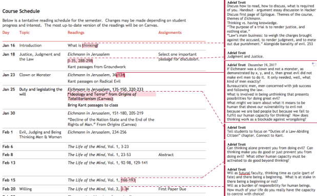 Photograph depicts a selection of syllabus with course readings. Dates to the left, readings in the center, comments inserted on the right.