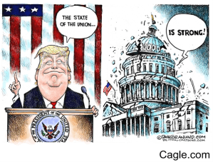 What we need to be concerned with is what Trump says he will do (full transcript here) and what Trump seems capable of doing. We need to consider whether Trump’s efforts to “Make America Great Again for All Americans” will, or whether they are in fact only for some Americans, as I argued over the weekend. To that end I would say, if the measure of the State of the Union is the strength of our people, as Trump says it is, people who don’t feel like things are so good for them might still affirm the strength of the Union to acknowledge their own strength. But if the measure is in fact how the working class, the sick, the immigrants are doing, it is not through lack of strength that they are not doing well, but tax cuts for the rich, resistance to buttressing the ACA, travel bans on Muslims and revocations of immigrant status that these people are not doing well. The required support for the military and the police, the demand to stand for the anthem, these are the things that divide, that ignore why some Americans do not see the government, the police or the flag as standing for them. The celebration of the 2nd Amendment when there have been 11 school shootings in January of this year is a mockery. The cheering of tax cuts in that chamber testifies to the divide between what those people think a strong union looks like and what the rest of us would require for the union to be strong. The politicization of the Courts and the stated political position that judges will be expected to have who are nominated cheap. The notion that federal employees can be removed for perceived undermining of the public trust or failing of the American people pits the work of civil servants against the demands of their political administrators.