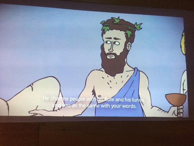 Another room has an illustrated animated cartoon of Plato’s Symposium, with some pretty spectacular renditions of Socrates and Alcibiades. This image pretty much captures Socrates as Silenus.