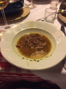After a leisurely beginning, we were invited inside. Our party of seven–three Slovenians, one Canadian and three Americans–was big enough to be able to enjoy this meal which requires a decent-sized party for it to be worth it, but small enough to share one conversation. The wait staff brought wine with each course — the wine changed after the soup courses. And a traditional lemonade and a water, which the server called, “decoration.”