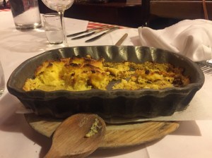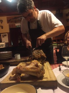 After the fish, they brought out a box, and opening it, revealed the last of the main courses, the veal knuckle. They carved the knuckle in front of us and then added the meat into a pan of fried potatoes and quickly cooked the meat in with the potatoes and served each person a course of a smallish piece of meat and some potatoes. As much as I thought I wouldn’t be hungry at this point, I was happy to eat.