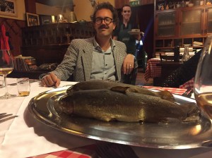 The cheese polenta that followed was so good. The best part was the crust we scraped off the bottom of the pan. But the most incredible part of the meal, the part of the meal I can still taste in my mouth, was the trout. The server brought out two beautiful trout on a platter and then deboned them right there on the table in a performance that was as efficient and entertaining as the fish was moist and full of taste. Using rubber gloves she felt through the flesh to remove all the bones. The fish is steamed and smoked so it is full of flavor without losing its moisture. After dinner they showed us the box they use to smoke and steam it, a process I haven’t quite figured out because it seems like the smoking would be transformed into steam by the steam. I think they must have to do one process than the other.
