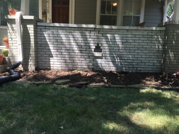 The wall behind the bushes, that I seriously cut back last winter and they never grew back so I had them pulled out, is the one that I repainted. Now I know why they had bushes there!