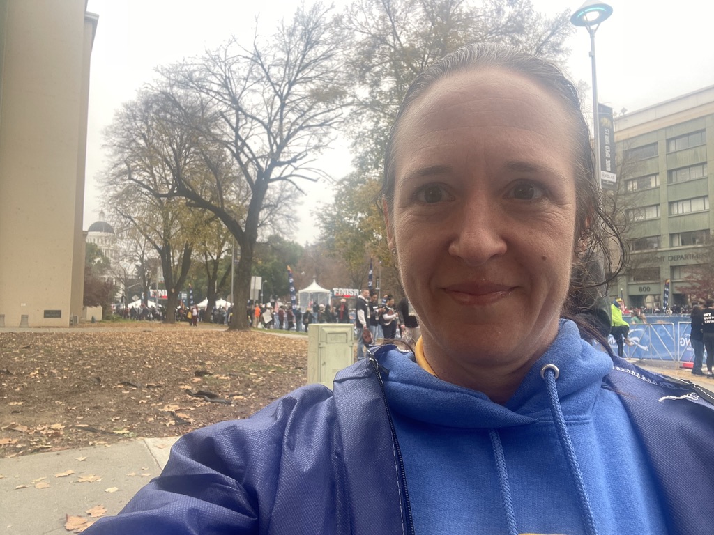 Saturday morning I woke up and my ears still hadn’t popped. Grrr. I met up with the Rogue group to do the shakeout run. I suggested we all introduce ourselves and say something about what the race is for us. There were a lot of folks running races much faster than I was trying to run, but I reminded myself that if we are running our hardest, my hardest is as hard and easy for me as their hard is hard and easy for them. We ran about 3 miles around Capitol Park and saw the finishing line. Then I went to breakfast and relaxed in the room for a little before going to meet my roommate and move to the third hotel room of my time in Sacramento.