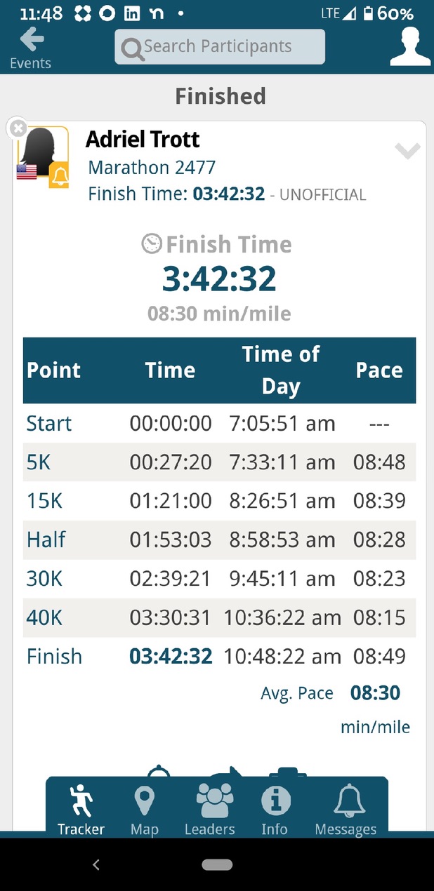 In the 2nd 10k, I continued to maintain pace but maybe I slowed a little bit because I really kept trying not to fight the hills – did I say there were many? The 3rd 10k continued to feel good — honestly I felt good until 40k. I really started to say to myself then, embrace the suck! Earlier in the race, I’d feel a small issue — calves, left quad, 2nd toe on right foot (which is now coming off), and then I’d say no, and repeat my mantra, “I feel strong, I feel powerful, I feel capable.” It helped that my playlist included Dj Khaled’s All I Do is Win, Taylor Swift’s Shake it Off, Queen’s Fat Bottomed-Girls, Cake’s The Distance, Nina Simone’s Sinnerman. At mile 13, I was like, another half, I can do that. I was getting faster with each mile, and I felt like I could do it, even as I also kept trying not to charge the hills. I remember the thought at mile 20 that it was already mile 20. Some guy said as we were approaching the bridge that this was the last hill of the race. That was a lie. Mile 24 felt hard, but I still ran it at 8:11 — I was supposed to be doing three miles at 8:05 at the end. I wasn’t quite there. I don’t like to blame my equipment, but I think the shoes were not quite right. I realized at certain points that I was running on the balls of my feet (thus the calf pain) and so I tried to force myself to land midfoot on the whole shoe and I realized the sneaker actually made me a little flat-footed. I knew when I ran in these shoes for a couple quality runs that they felt a little awkward, but I just thought, maybe I don’t know how a racing shoe is supposed to feel. But I think a racing shoe is supposed to feel really really comfortable. Now I know. Anyway, at mile 25, I did run 8:06. But mile 26, my calves felt tight, I felt stiff, I was talking myself into each tenth of a mile. I was seeing people ahead and thinking I can try to stay this close to them. Mile 26 was the same pace at the first mile, which I found disappointing because I wanted to really finish strong. I was saying that to myself and I did in fact do the last 2 tenths a bit faster at 8:21. It surprised me that I had sped up because I thought I was just hanging on at that point. But I did it. 3:42:32. 7 minutes and 28 seconds ahead of the BQ time. I was so happy with myself. I just walked around the circle at the finish with a smile on my face. My legs hurt. I felt a little queasy. But I ran my first marathon. I qualified for Boston. I got some fluids and some bars and walked around to the finish line to cheer in my teammate.