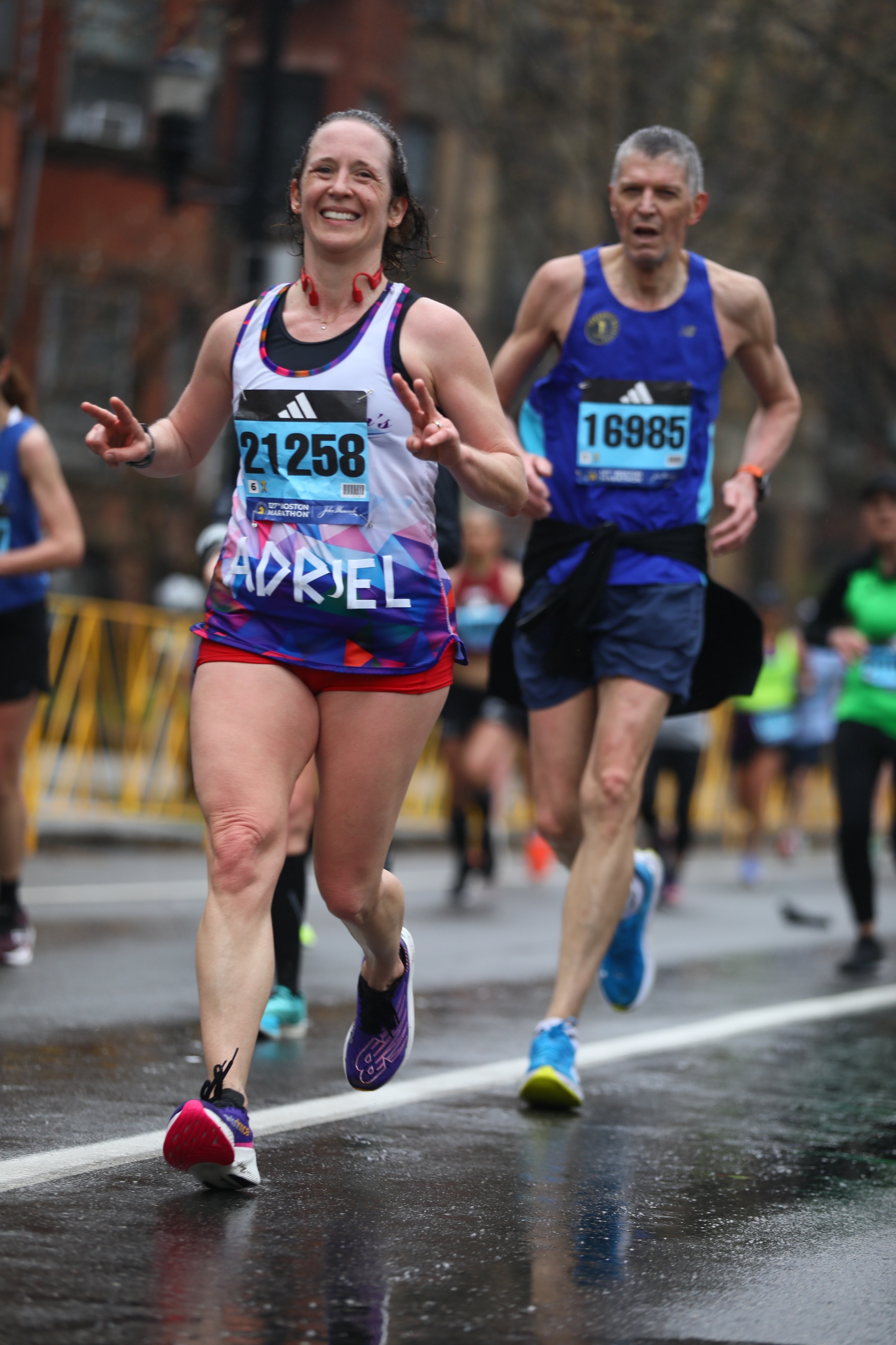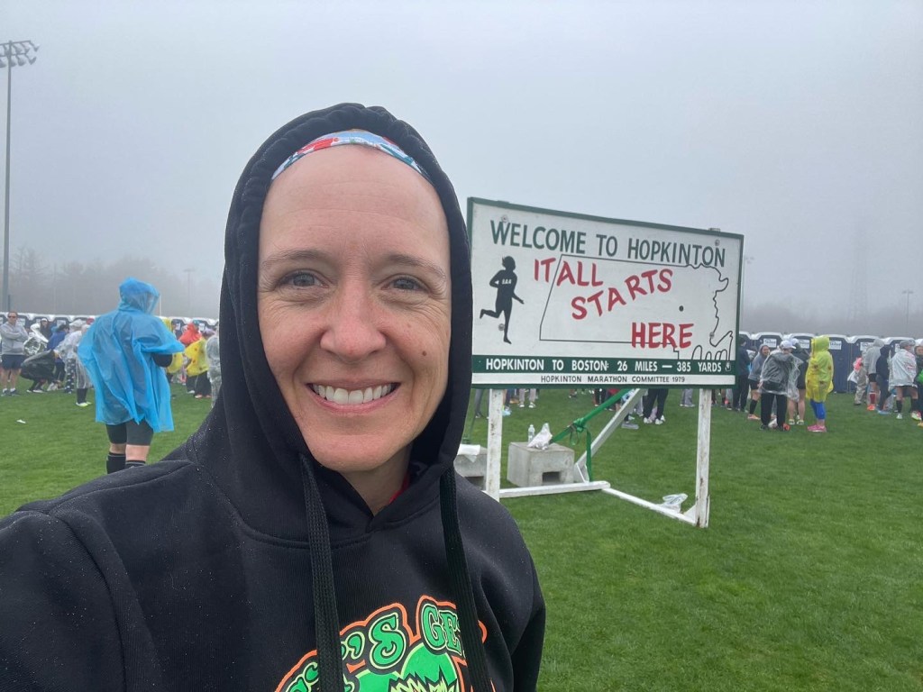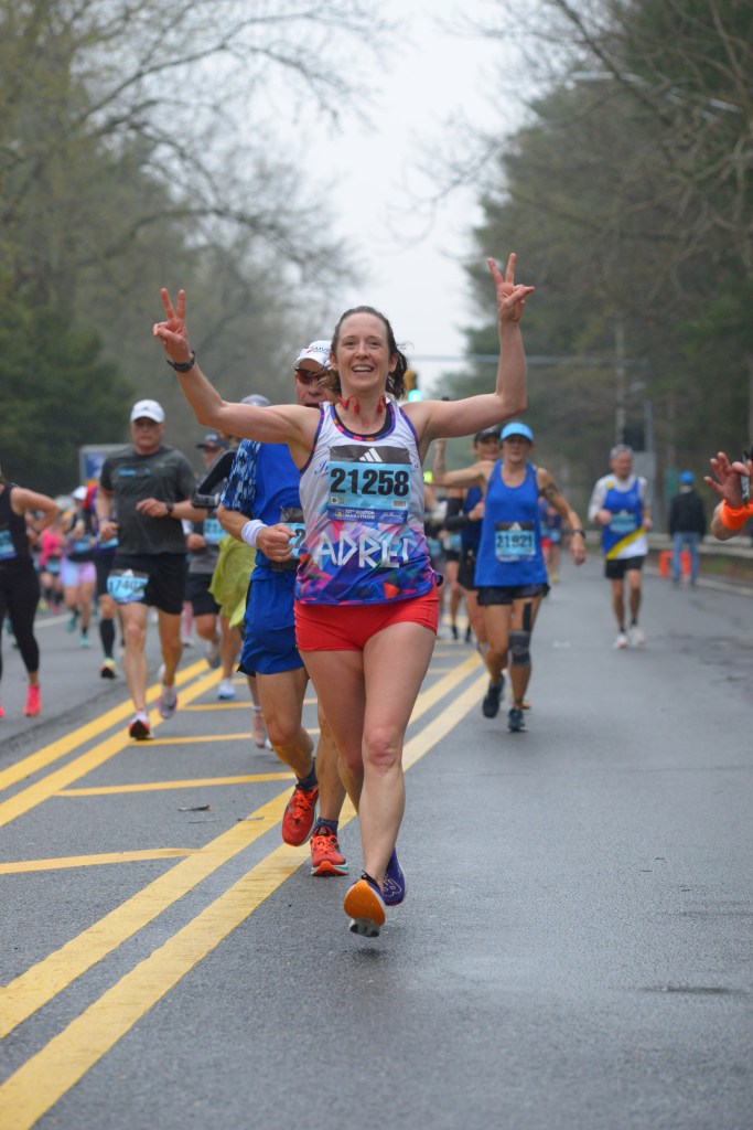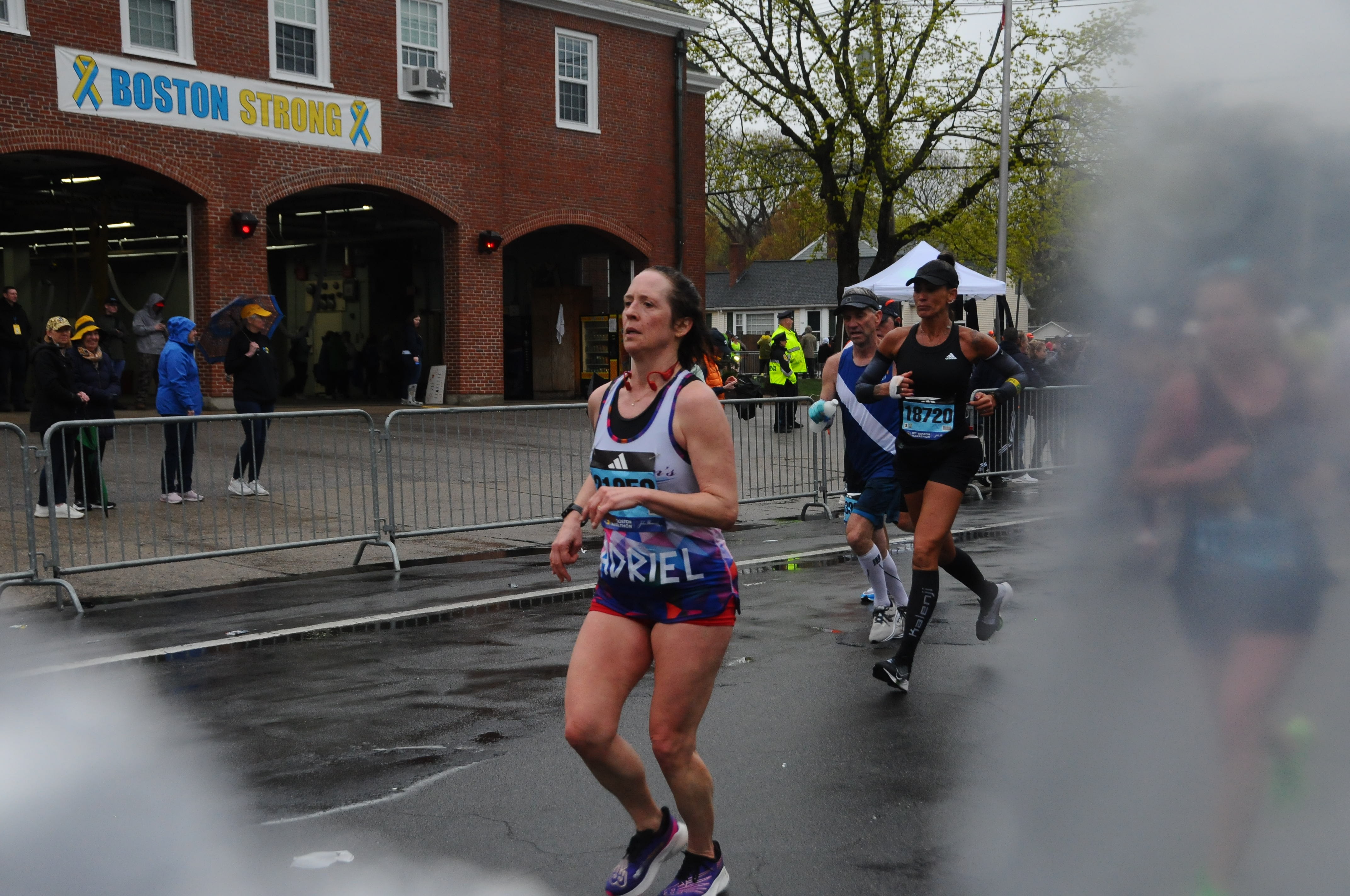 For my second marathon, I ran Boston. I had planned to run the Chicago Marathon in October, but I ran too long through a hamstring injury and ended up having to take off for about eight to ten weeks. I remember being thrilled to come just a little bit close to my marathon pace at the Thanksgiving Drumstick Dash in Indianapolis. My first ten miler was January 1 and I was slow. I ended up with a training block I could be proud of, but I only had time (in terms of weeks to build up and before the race) to get in two 20- or 22-mile long runs. This season I added heavy lifting twice a week, which helped with rehab and with those Boston hills. Because of the injury, I was slow in my recovery and long runs through the whole block. I saw myself running paces I had never seen before, dipping at times to about three minutes or more off my MGP. I was delighted to hear Nell Rojas say on the Running Rogue podcast that she often does long runs and recovery runs at 3+ her MGP. But it did kind of get in my head. I was still generally hitting paces in workouts, but I don’t think they were quite at the same intensity and it often took more reps to get to the target pace. All this to say, it was a return-from-injury training cycle. I knew that. But also, at the same time, last July, I couldn’t quite see myself in Chicago. Even before the injury took a bad turn, I didn’t see it. But I did see myself in Boston. My teammate from Rogue’s She Squad, Colleen Reutebuch gave me a book, 26.2 to Boston: A Journey into the Heart of the Boston Marathon, when I qualified at CIM. Each chapter is the history and the terrain of each mile. When I read it, I could see myself there. I read it again this winter as well as every other podcast I could get my hand on that described the feel of the race and I could continue to see myself running those streets from Hopkinton to Boyleston.