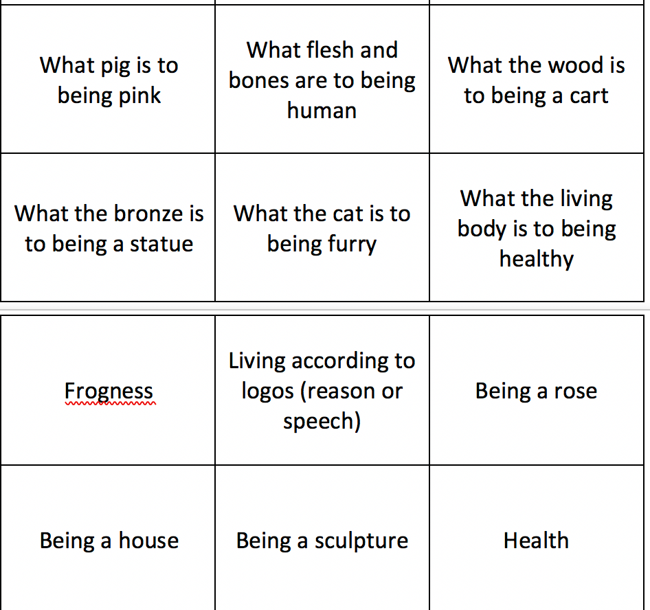 I’m on a roll folks. After I did the last group activity, I was inspired to do another, and I think this one was even more successful in getting students to think about Aristotle’s Metaphysics. For this game, I distributed envelopes to every group. In the envelopes were two sets of flashcards that I had made. One set was the same in every envelope. It included all of the four causes, the ways of being, and the candidates for substance. In the other set were instances of one of these.